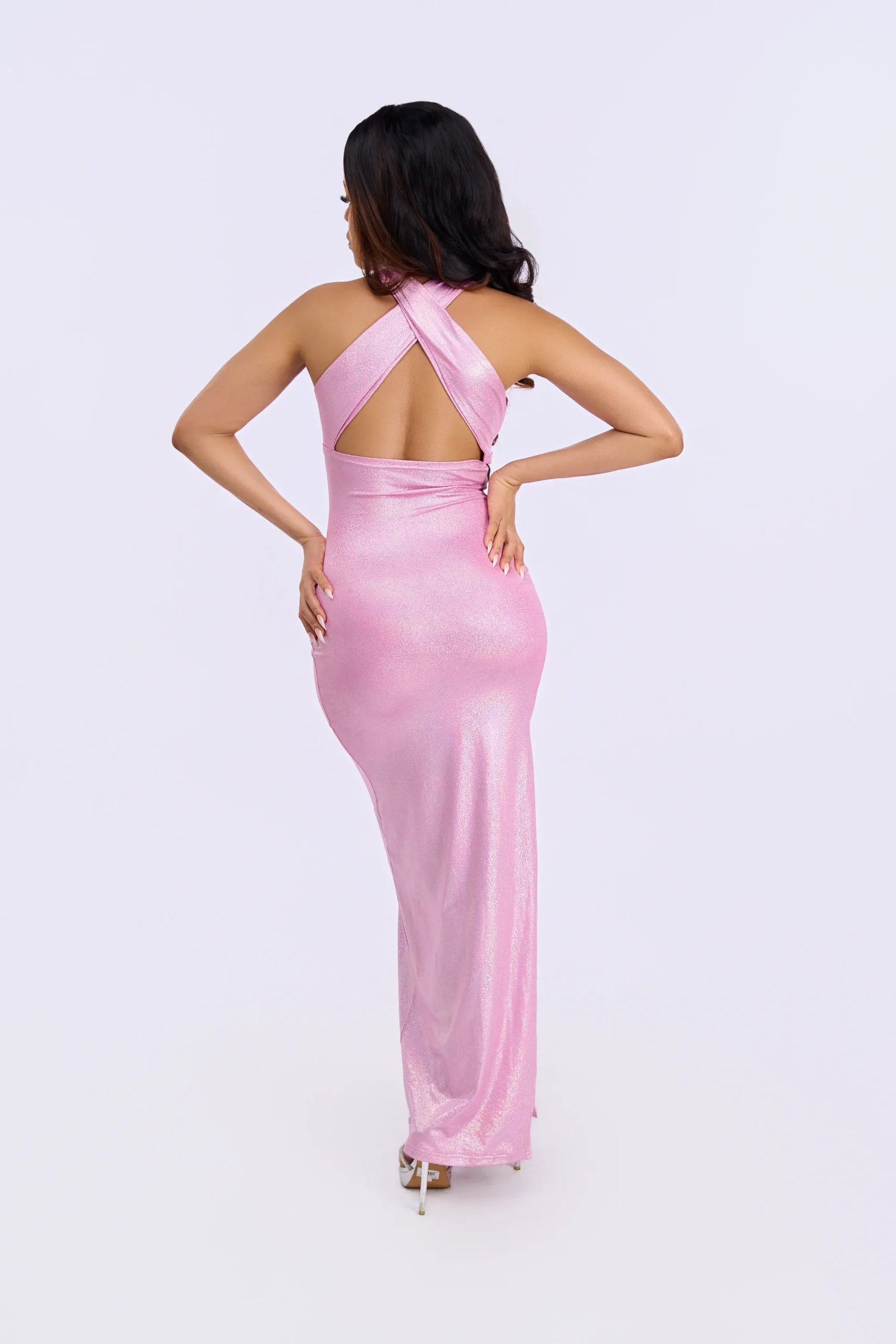 Baby pink dress featuring a v-neck, cross-back and sleek slits made to steal the spotlight